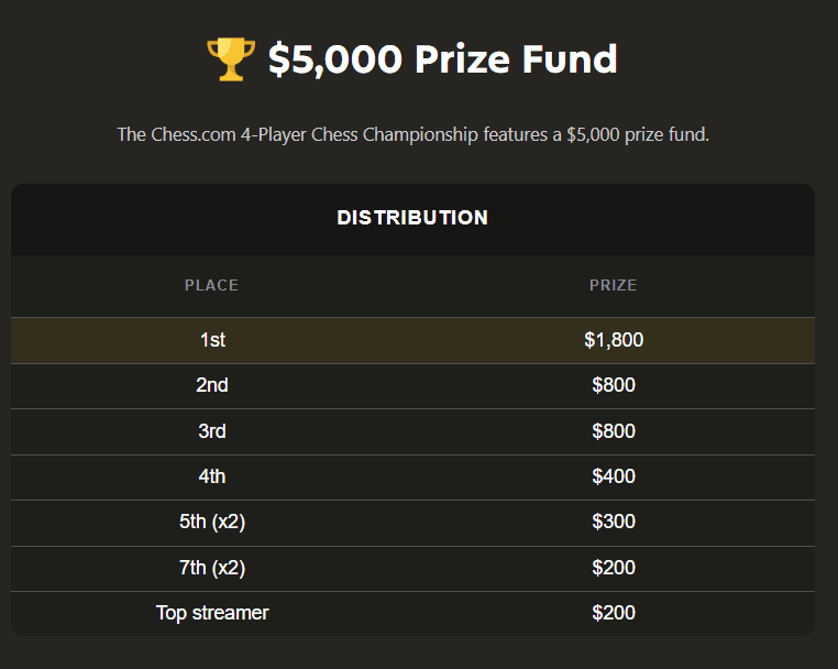 The 4-Player Chess Championship is part of the 2026 Chess.com Community Championships, and the event was open to all members of the Chess.com Community Club. The winners of eight Qualifiers played in Semifinals and a Final to decide the best 4-Player Chess player on Chess.com. The event featured a $5,000 prize fund.