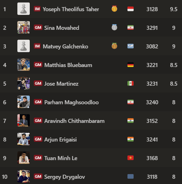 In the ninth round, Maghsoodloo defeated Taher, preventing him from winning a third consecutive event.