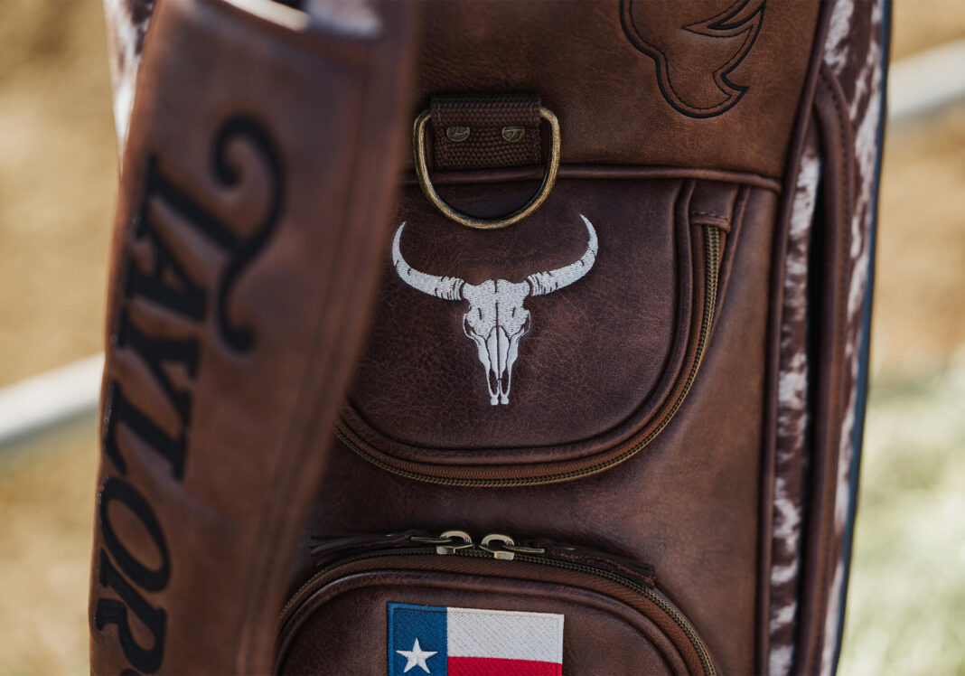 The details earn their spots. A sheriff’s badge on the valuables pocket nods to the law of the land. A cowhide skull on the back pays tribute to the livestock show that put Houston on the map. A rope wraps the base, a subtle salute to rodeo culture. The TaylorMade script is rendered in 3D raised chain stitch across both side panels.