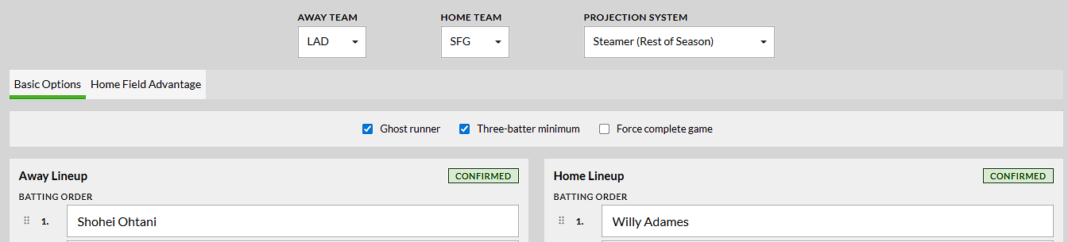 Last week, we released a baseball simulator in the FanGraphs Lab. This week, we’re adding home field advantage to the simulator. You can toggle HFA on and off using a new menu option: