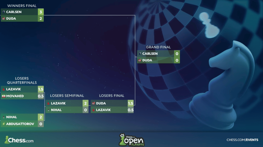 GM Jan-Krzysztof Duda will have a rematch with GM Magnus Carlsen in the Grand Final of the 2026 Chess.com Open Playoffs. On Saturday, the Polish star won the Losers Final 1.5-0.5 with the black pieces in a sharp Nimzo-Indian Defense against GM Denis Lazavik.