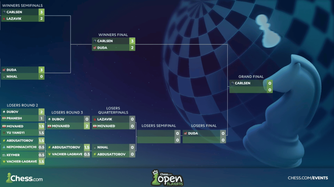 GM Magnus Carlsen defeated GMs Denis Lazavik and Jan-Krzysztof Duda, with a 3-2 score in both matches, to advance to the 2026 Chess.com Open Playoffs Grand Final. Just by reaching the Winners Final, however, Duda has earned one of the three qualifying spots to the 2026 Esports World Cup.
